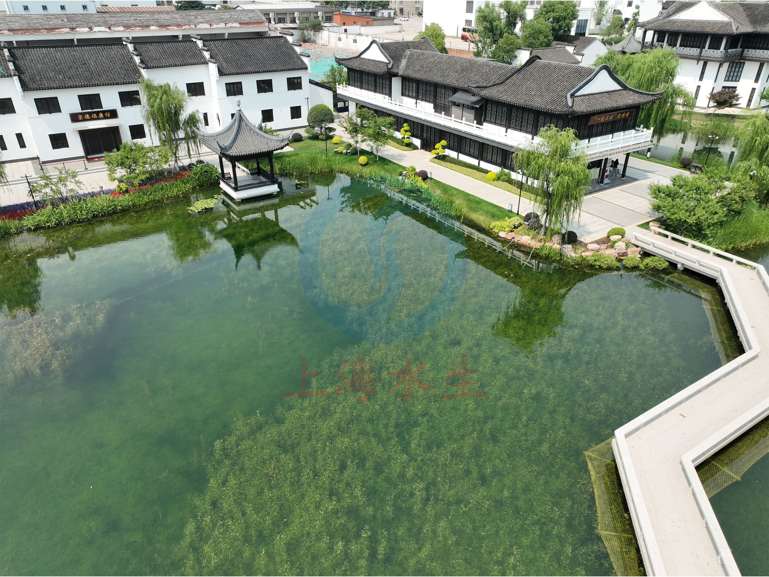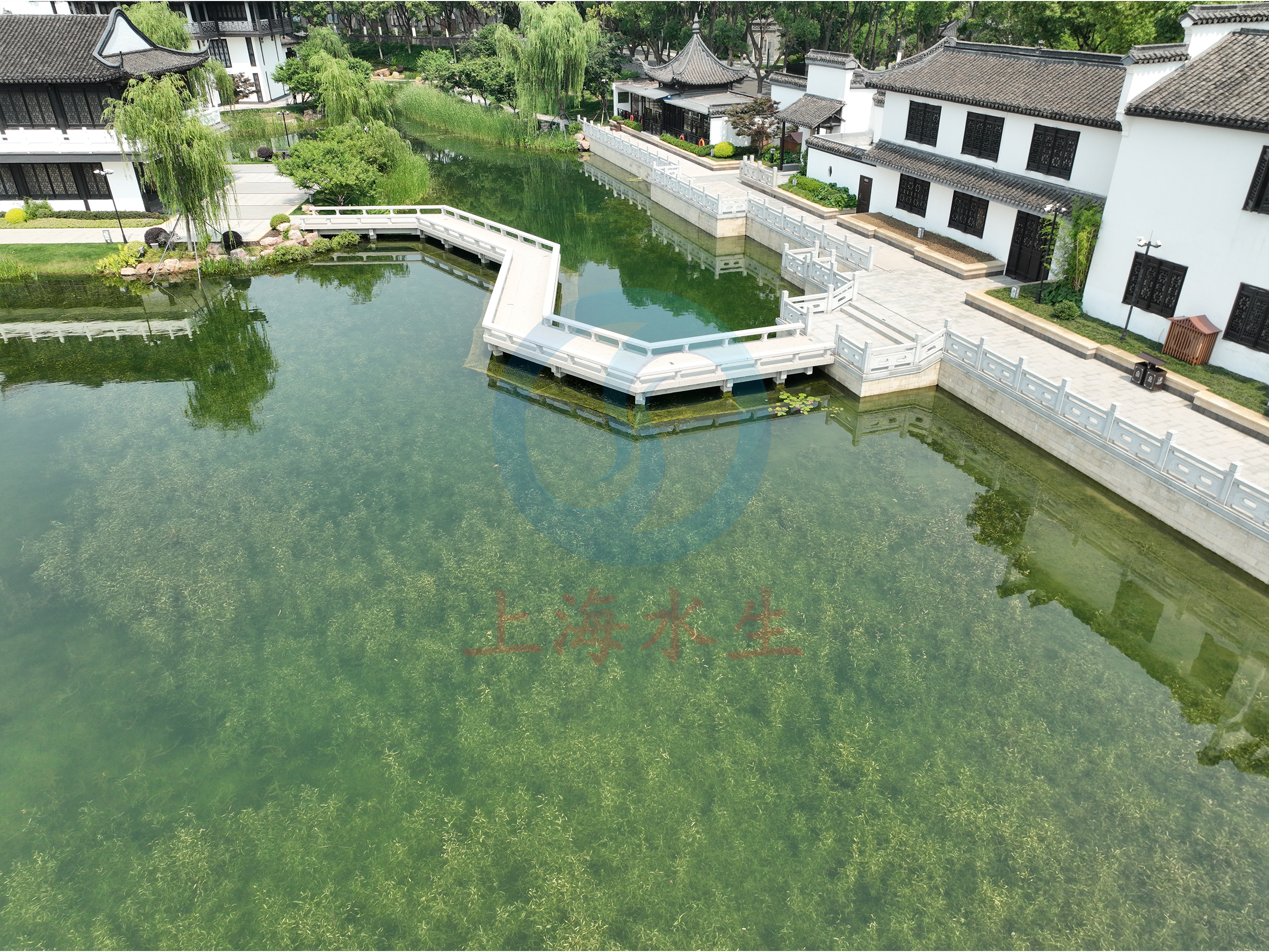项目概况 本项目治理水域为封闭型景观水体,水域面积约8143m2,治理前无沉水植物,驳岸处有少量挺水植物黄菖蒲,长势不佳;项目水体存在一处雨水排口。